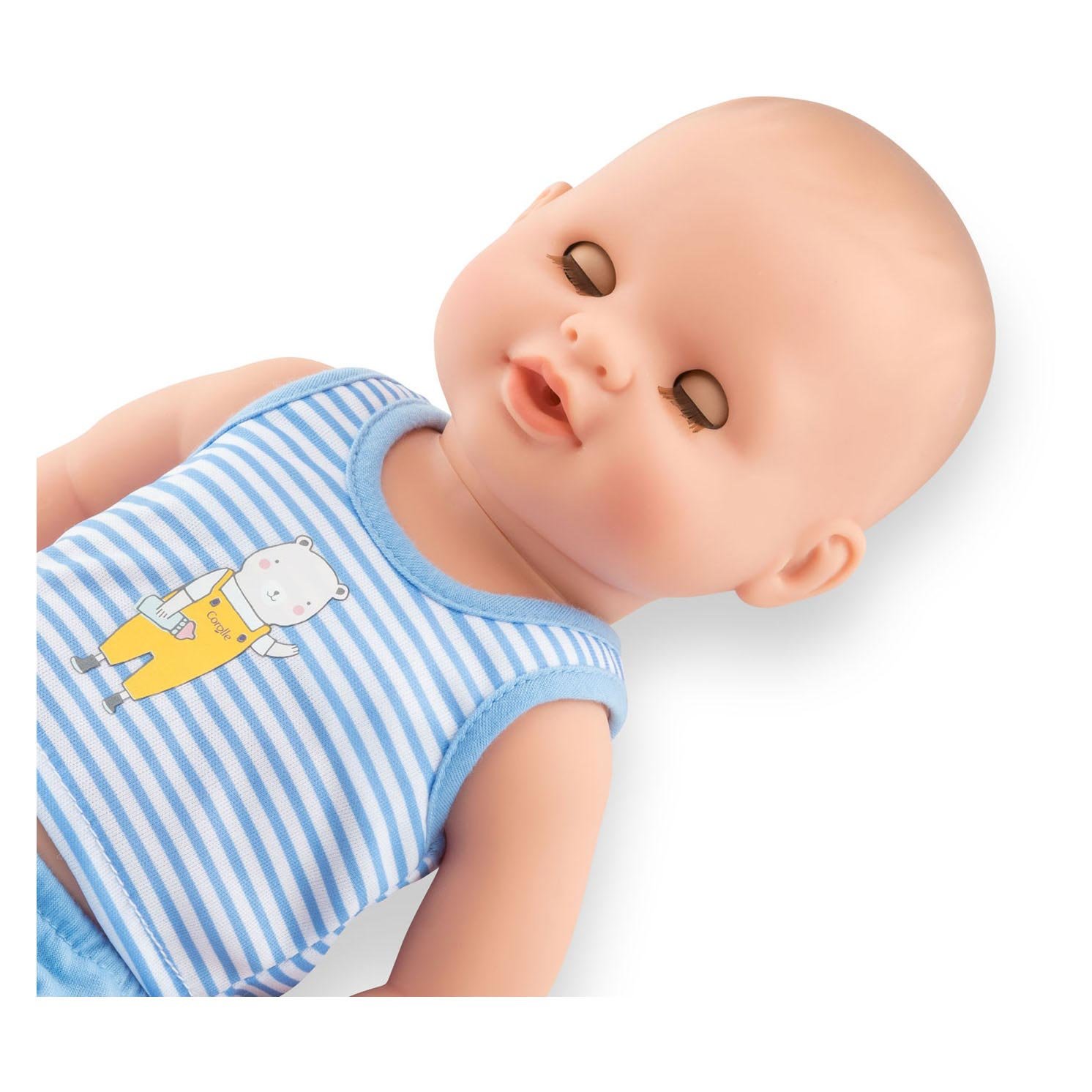 De Corolle Mon Grand Poupon Drink- en Plaspop – Paul is 36 cm groot, gemaakt van zacht vinyl en daardoor ideaal om mee te knuffelen. Bovendien is hij waterbestendig, zodat hij ook mee in bad mag! Dankzij zijn vriendelijke gezichtje en zachte geur – kenmerkend voor Corolle – voelt deze pop net als een echte baby aan.