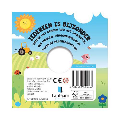 Iedereen is Bijzonder – Babydieren Vingerpopboekje is een vrolijk en interactief vingerpopboekje dat speciaal is ontworpen voor jonge kinderen vanaf 2 jaar. Ga samen met het schattige lammetje op avontuur en ontdek hoe leuk lezen kan zijn! Dit stevige boek nodigt peuters uit om actief mee te doen dankzij de ingebouwde vingerpop met een piepend geluid. Zo wordt voorlezen een speelse beleving waarbij luisteren, voelen en ontdekken samenkomen.