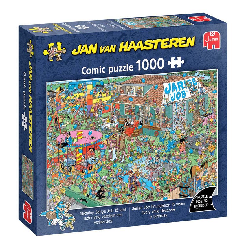 De Jan van Haasteren Stichting Jarige Job 15 jaar, 1000st. puzzel is een feestelijke, vrolijke en betekenisvolle jubileumuitgave waarmee je niet alleen plezier in huis haalt, maar óók een kind een onvergetelijke verjaardag bezorgt. Deze speciale 1000-stukjes puzzel staat volledig in het teken van het 15-jarig bestaan van Stichting Jarige Job, die zich inzet voor kinderen in Nederland die hun verjaardag niet kunnen vieren omdat er thuis te weinig geld is.