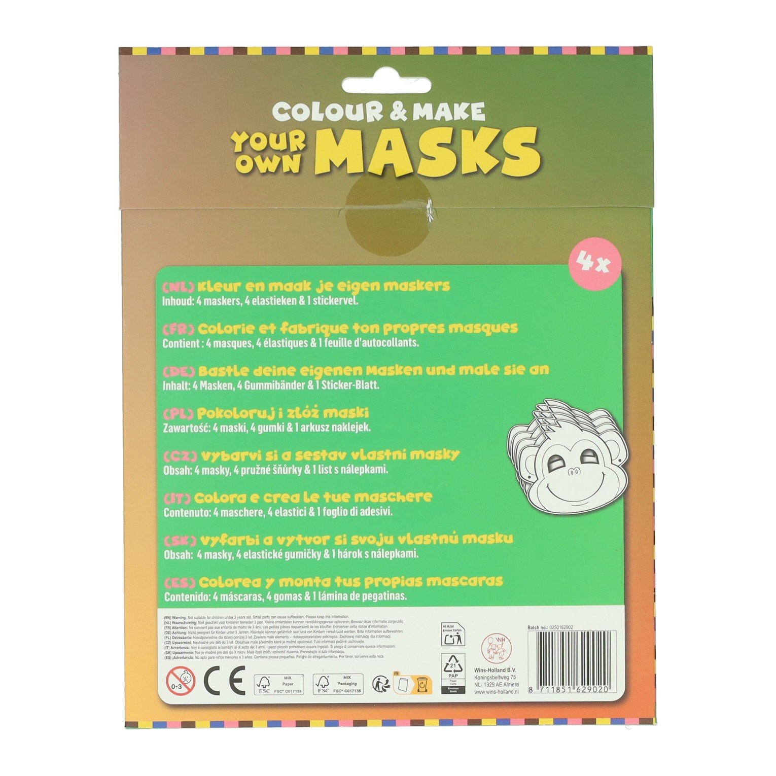 Deze set bestaat uit 4 kartonnen maskers in een speels aapjesdesign die volledig naar eigen wens ingekleurd kunnen worden. De maskers hebben een formaat van Ø 26 x 23 x 18 x 1 cm en zijn gemaakt van stevig papier, waardoor ze goed bestand zijn tegen enthousiast