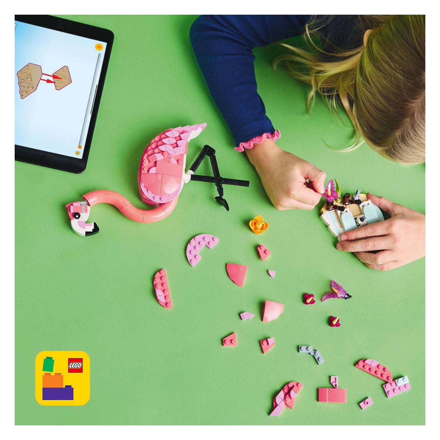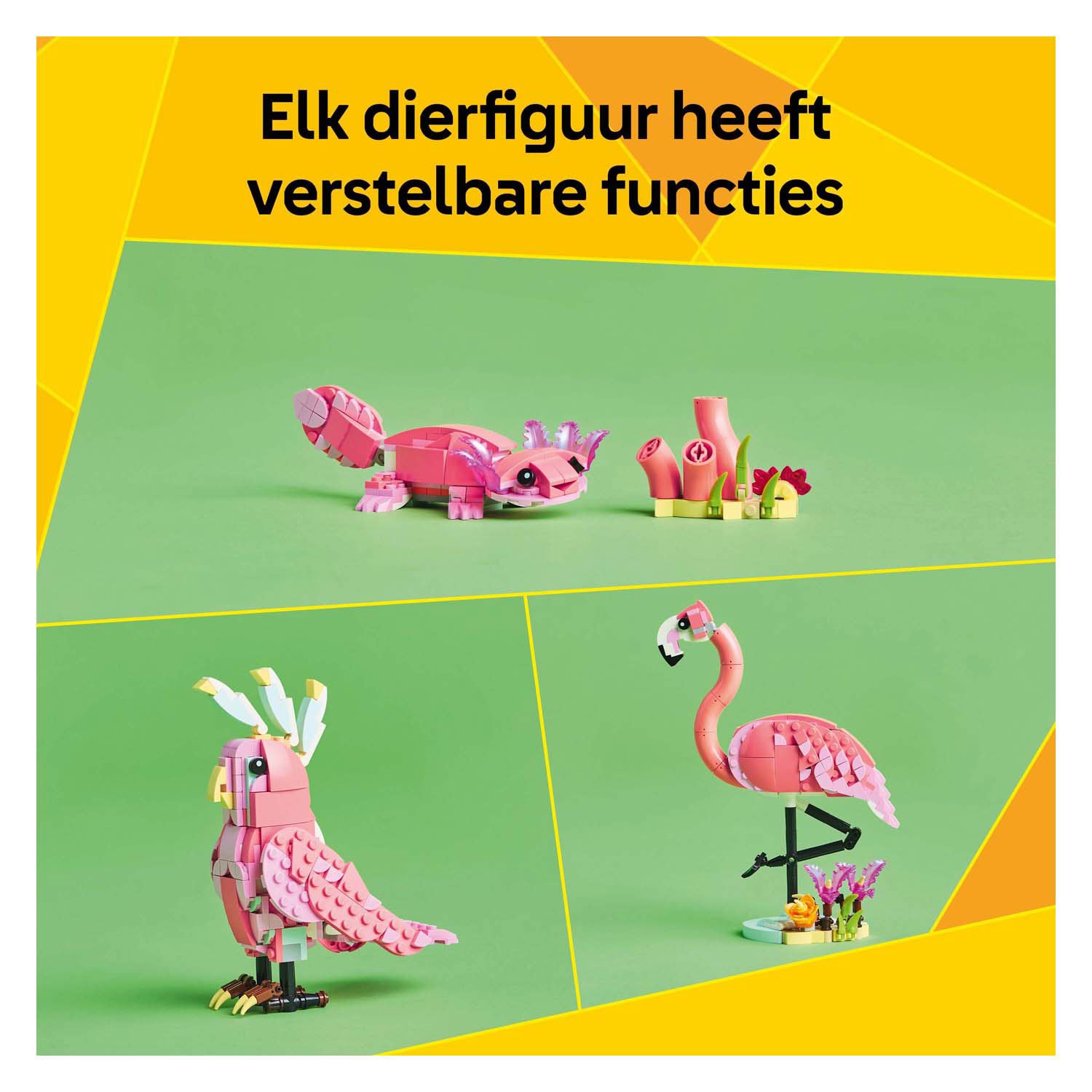 De flamingo heeft een beweegbare kop en poten en staat trots op een met planten versierde standaard. De kaketoe kan zijn kop 360 graden draaien, terwijl de axolotl in een onderwaterwereld met planten leeft. Deze veelzijdige LEGO Creator 3-in-1 set stimuleert creativiteit, verbeeldingskracht en hand-oogcoördinatie — perfect voor jonge dierenliefhebbers die graag bouwen en ontdekken.