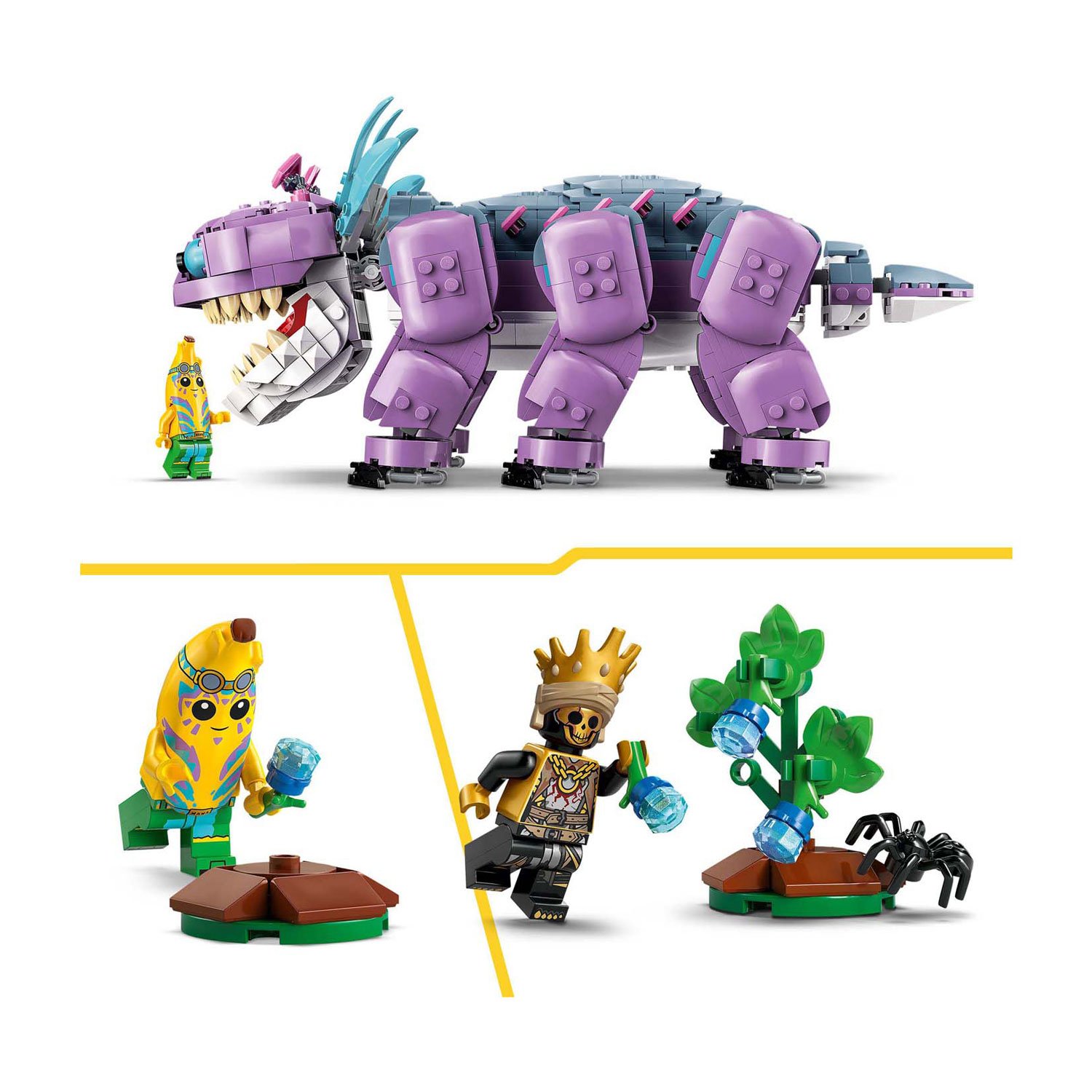De beweegbare poten, de openklapbare bek en de draaibare staart zorgen ervoor dat Klombo net zo levendig is als in de game. Dankzij de meegeleverde minifiguren van Island Adventure Peely en Oro kunnen kinderen hun eigen avonturen naspelen en de fantasierijke wereld van LEGO Fortnite tot leven brengen. Met de Klomberry struik en de afneembare Klomberries kun je Klombo plagen of voeren – net als in het spel!