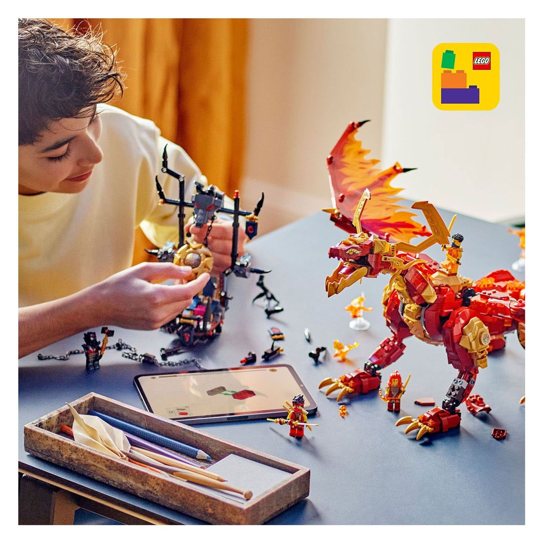 De LEGO Ninjago 71822 Brondraak van Beweging set bevat zes minifiguren, waaronder de geliefde ninjastrijders Kai, Wyldfyre en Arin, elk uitgerust met unieke wapens en accessoires. Zij nemen het op tegen de schurken Lord Ras, Jordana en een Wolvenmasker-strijder. Samen zorgen ze voor eindeloos veel LEGO Ninjago speelplezier. Dankzij de LEGO Builder app beleef je een intuïtief bouwproces: draai het model in 3D, zoom in op details en volg eenvoudig alle stappen. Met 1716 onderdelen en een draak van ca. 39 cm hoog, 63 cm lang en 74 cm breed biedt deze set een enorme bouwuitdaging én een prachtige display.