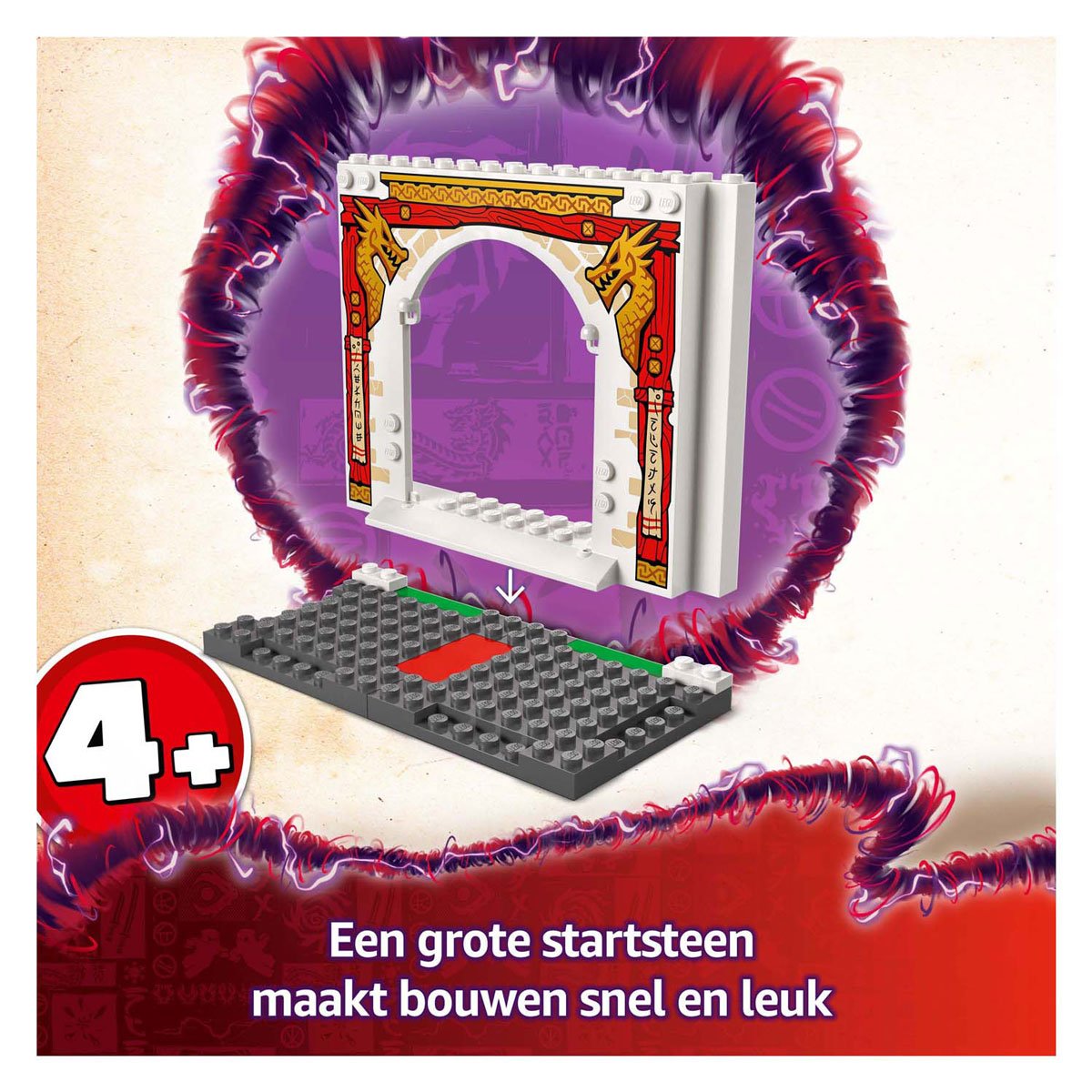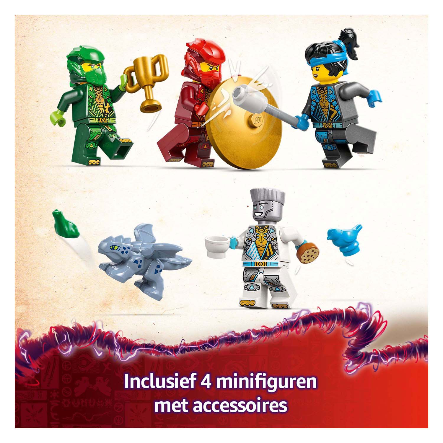 De LEGO Ninjago 71831 Spinjitzu Ninjatempel set bevat een gedetailleerd ninjatempel met podium, tuin, theehuis en een trainingsgedeelte vol wapens. Kinderen kunnen scènes naspelen uit seizoen 3 van de serie NINJAGO: De Drakenstrijd, waarin de ninja’s nieuwe uitdagingen aangaan. Met 4 minifiguren – Zane, Nya, Kai en Lloyd – en de schattige drakenbaby Riyu is er genoeg om epische ninja-verhalen tot leven te brengen. De twee draaiplateaus maken spannende duels mogelijk, terwijl tal van accessoires zoals zwaarden, staven, een hamer, een vogel, kikker, trofee, koekje en een brief zorgen voor realistische details en urenlang speelplezier.