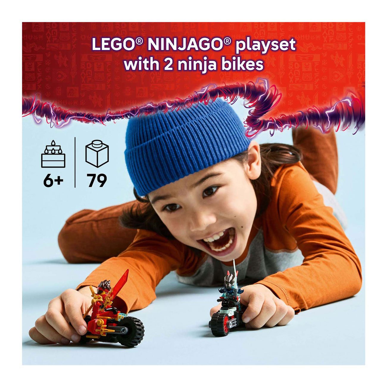 Beleef razendsnelle actie met de spectaculaire set LEGO Ninjago 71838 Kai’s Motorrace. Deze stoere speelset, bestaande uit 79 onderdelen, neemt kinderen vanaf 6 jaar mee in de wereld van seizoen 3 van de tv-serie NINJAGO® De Drakenstrijd. Met twee gedetailleerde ninjamotoren, krachtige wapens en twee heldhaftige minifiguren kunnen kinderen eindeloos confrontaties tussen goed en kwaad naspelen.