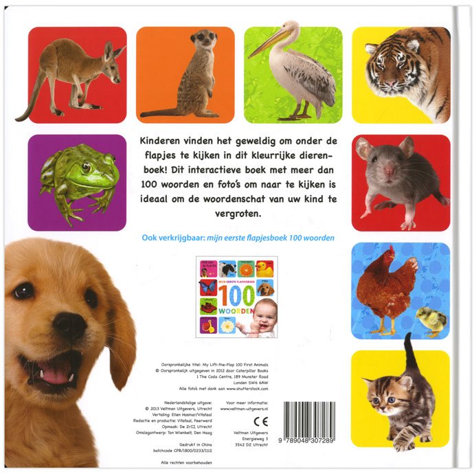 Mijn Eerste Flapjesboek 100 Dieren is een vrolijk en leerzaam flapjesboek dat jonge kinderen uitnodigt om spelenderwijs de wereld van dieren te ontdekken. Kinderen zijn dol op het openen van flapjes, en in dit stevige flapjesboek worden ze telkens opnieuw verrast. Met meer dan 100 woorden en kleurrijke foto’s stimuleert dit flapjesboek actief de taalontwikkeling en nieuwsgierigheid van peuters.