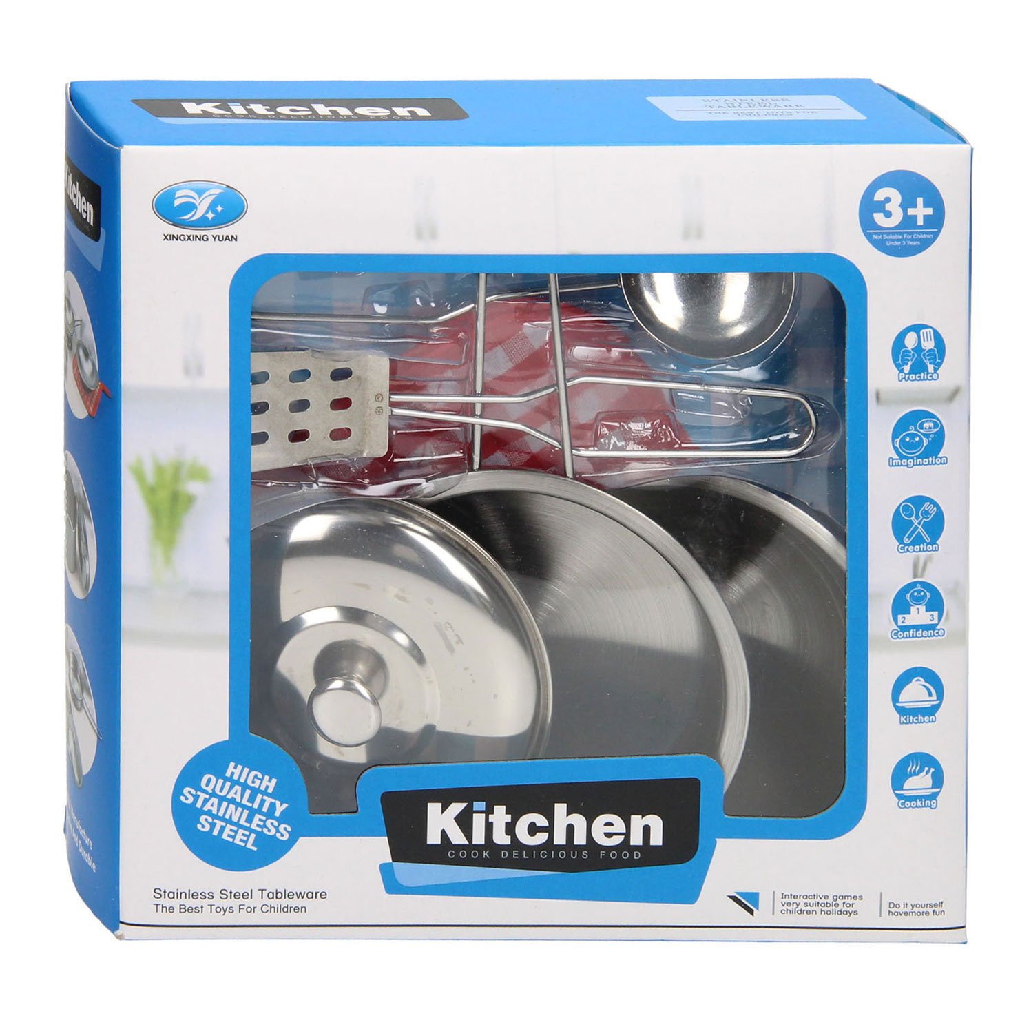 Deze pannenset bestaat uit maar liefst 6 onderdelen: twee metalen schalen, een deksel, twee opscheplepels en een katoenen pannenlap. Alles wat een kleine kok nodig heeft om direct aan de slag te gaan. De pannenset is compact verpakt (20 x 19 x 6 cm) en de koekenpan heeft een lengte van 17,3 cm, waardoor deze perfect in kleine kinderhanden past.
