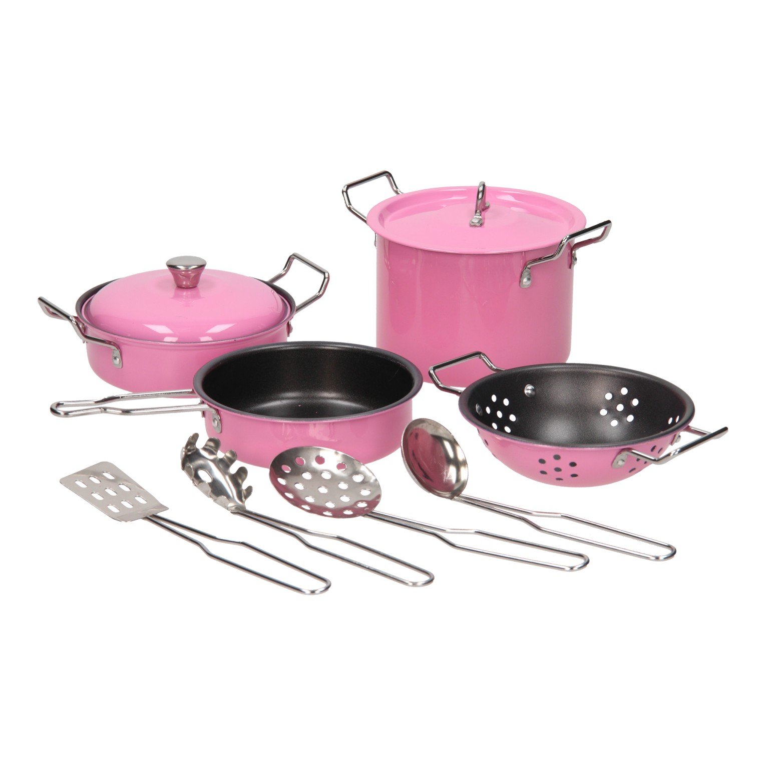 Deze Roze Pannenset bestaat uit alles wat een kleine chef nodig heeft: twee pannen met deksel, een koekenpan, een vergiet, vier stuks keukengerei en een charmante rood geruite pannenlap. Met een doorsnede van 9 cm zijn de pannen ideaal voor kinderen vanaf 3 jaar. De stevige RVS uitvoering maakt deze pannenset niet alleen mooi, maar ook duurzaam en veilig in gebruik.