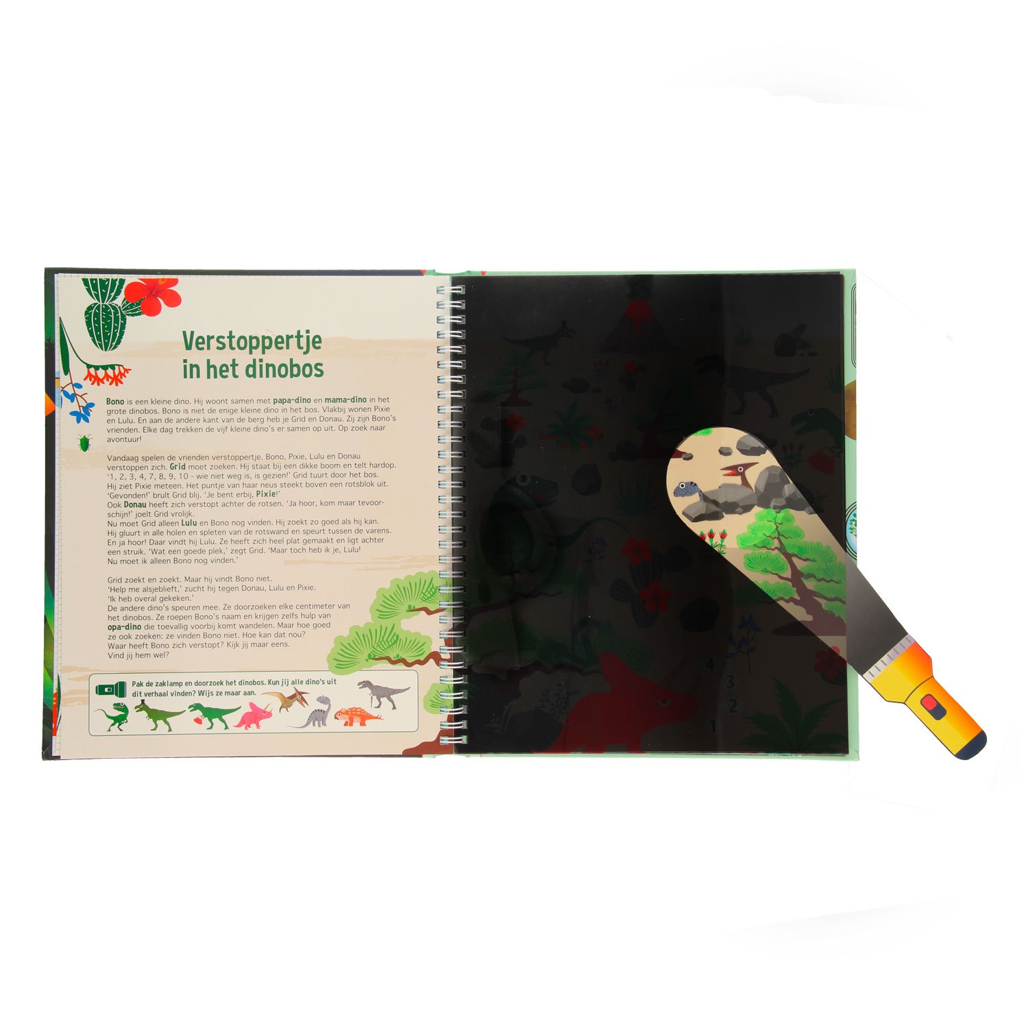 Dit unieke speurboek combineert fantasierijke voorleesverhalen met speelse zoekopdrachten. Kinderen vanaf 3 jaar worden actief betrokken bij het verhaal, terwijl ze ondertussen leuke weetjes over dinosaurussen ontdekken. Dankzij de stevige, witte kartonnen zaklamp kunnen ze keer op keer op speurtocht gaan. Speuren in het Dinobos + Kartonnen Zaklamp stimuleert de fantasie, concentratie en observatievaardigheden van jonge kinderen op een speelse manier.